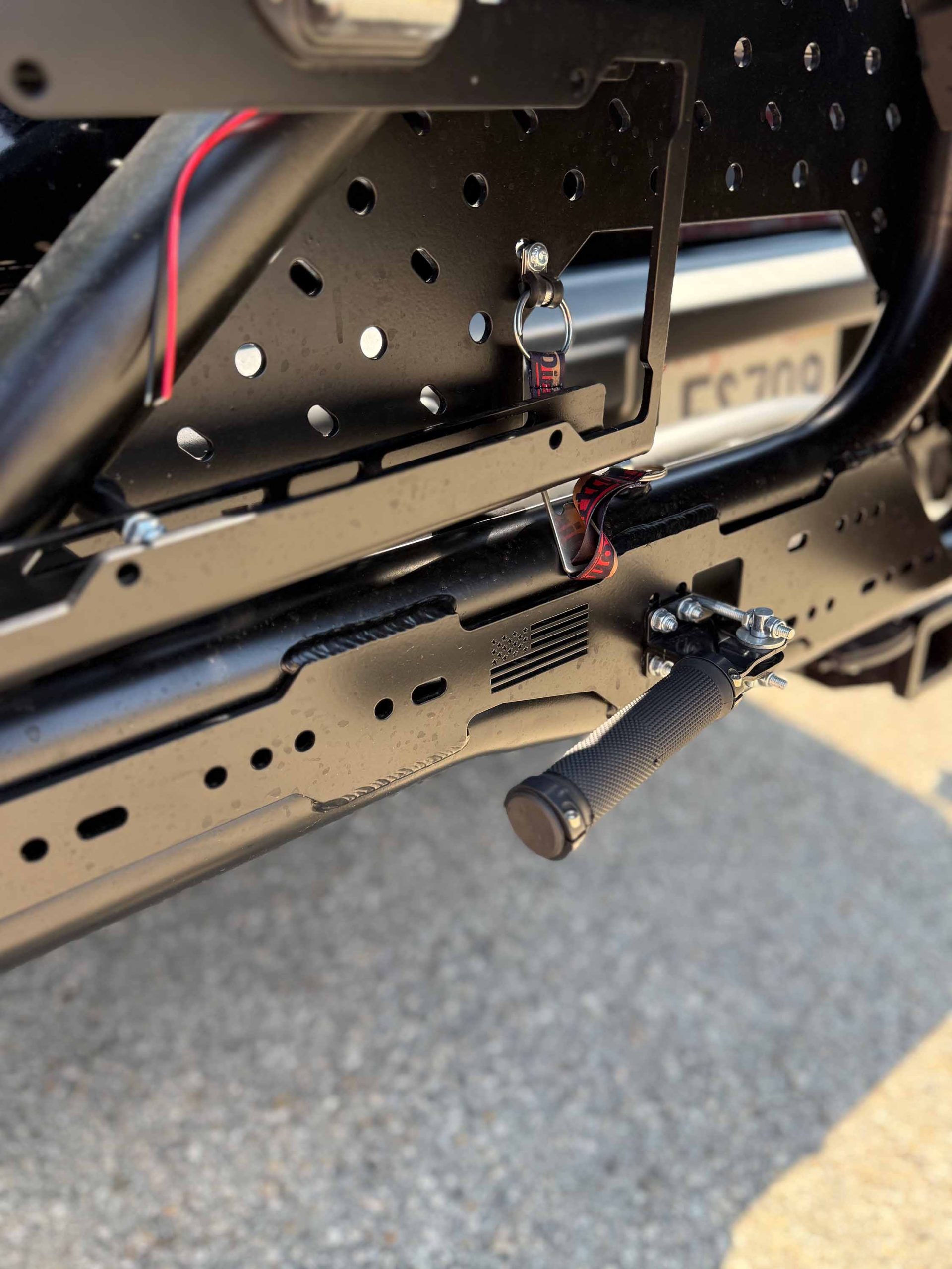 - Built in Mounting Points (Upgraded and Expanded on V3), mount your rotopax and license plate straight to the swing arm. Mount a Front Runner table with our Table mounts. 3/16" plates are laser cut with multiple holes to enable you to easily mount your own accessories with as large as 1/2" bolts.